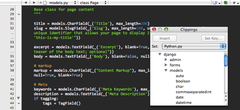 I took a break from Emacs this weekend to give the new version of BBEdit a spin. The first thing I noticed was that it doesn’t have snippets (clippings are the accurate term) for Django. Personally, I use yasnippet in Emacs so I took an hour and converted the library I use to clippings for BBEdit in the hopes someone finds them useful.